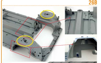 本誌第136号付属のシャシー前部の〇で示した突起の位置が、マガジン136号以降の組み立てガイド内の写真と実際の付属品で異なりますが、組み立てに支障はございません。