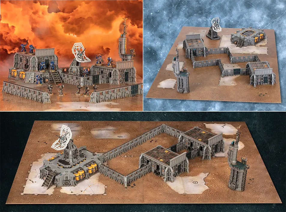 「ウォーハンマー40,000」の開拓区画を再現する地形モデル。組み換え式防御壁や帝国の建造物など、