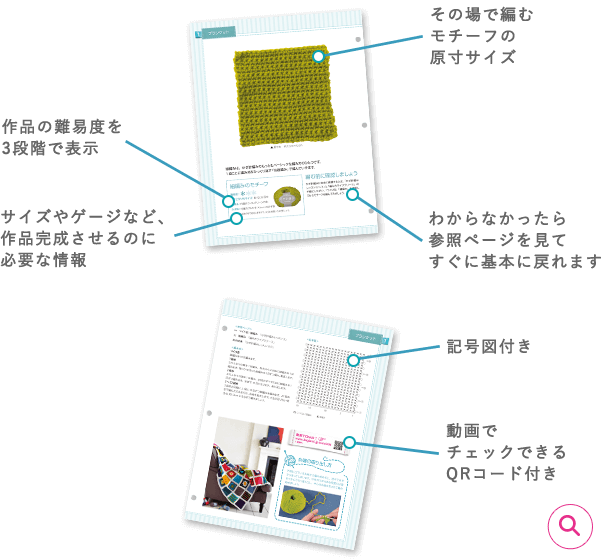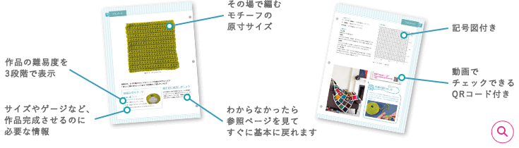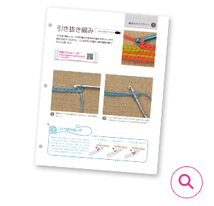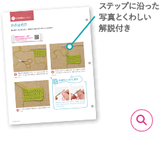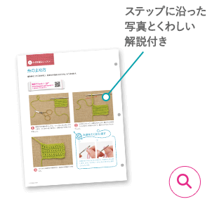 毎号、新しい模様編みや、モチーフに必要な編み方を写真付きで紹介します。ひとつずつ身に付けて作品に取り入れてみましょう。